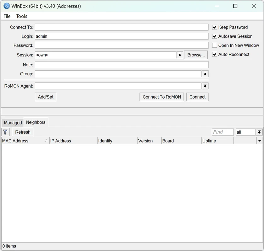 WinBox è uno strumento gratuito basato sul sistema operativo Windows che consente agli utenti di gestire i propri dispositivi RouterOS. Offre un'interfaccia di gestione grafica che consente agli utenti di controllare il proprio sistema da remoto, creando profili individuali per ciascun dispositivo e utilizzando RoMON per accedervi.